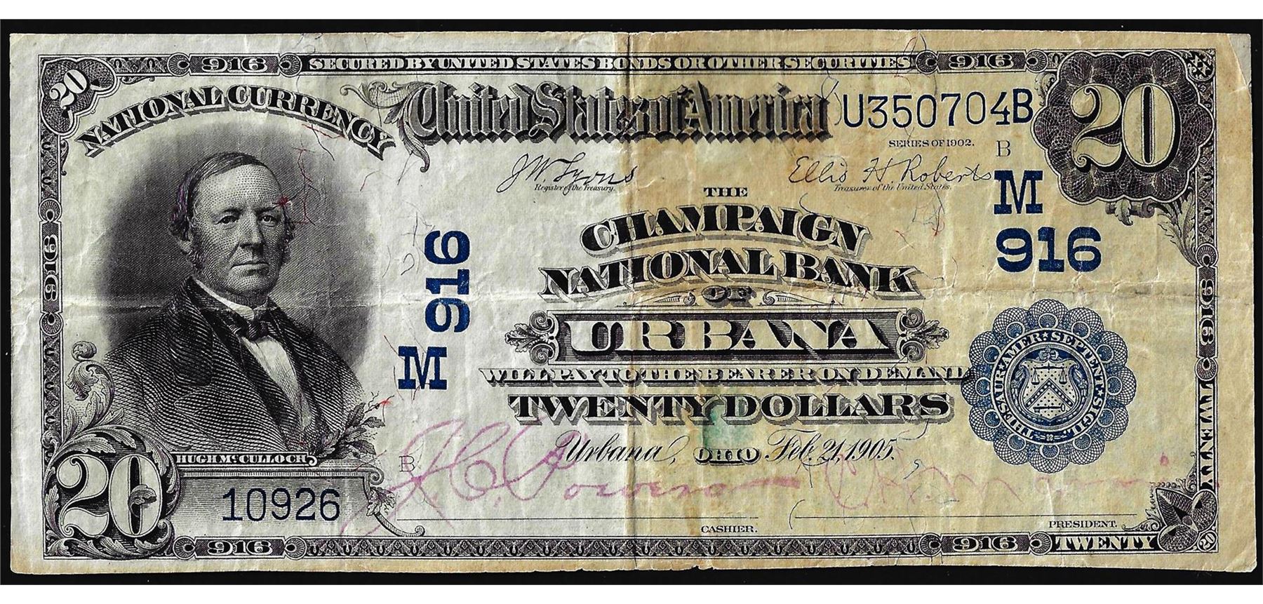 1902PB $20 Champaign National Bank of Urbana, OH CH# 916 National Currency Note