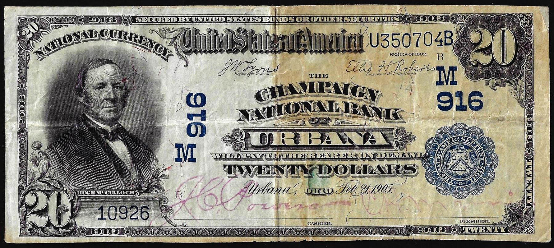 1902PB $20 Champaign National Bank of Urbana, OH CH# 916 National Currency Note