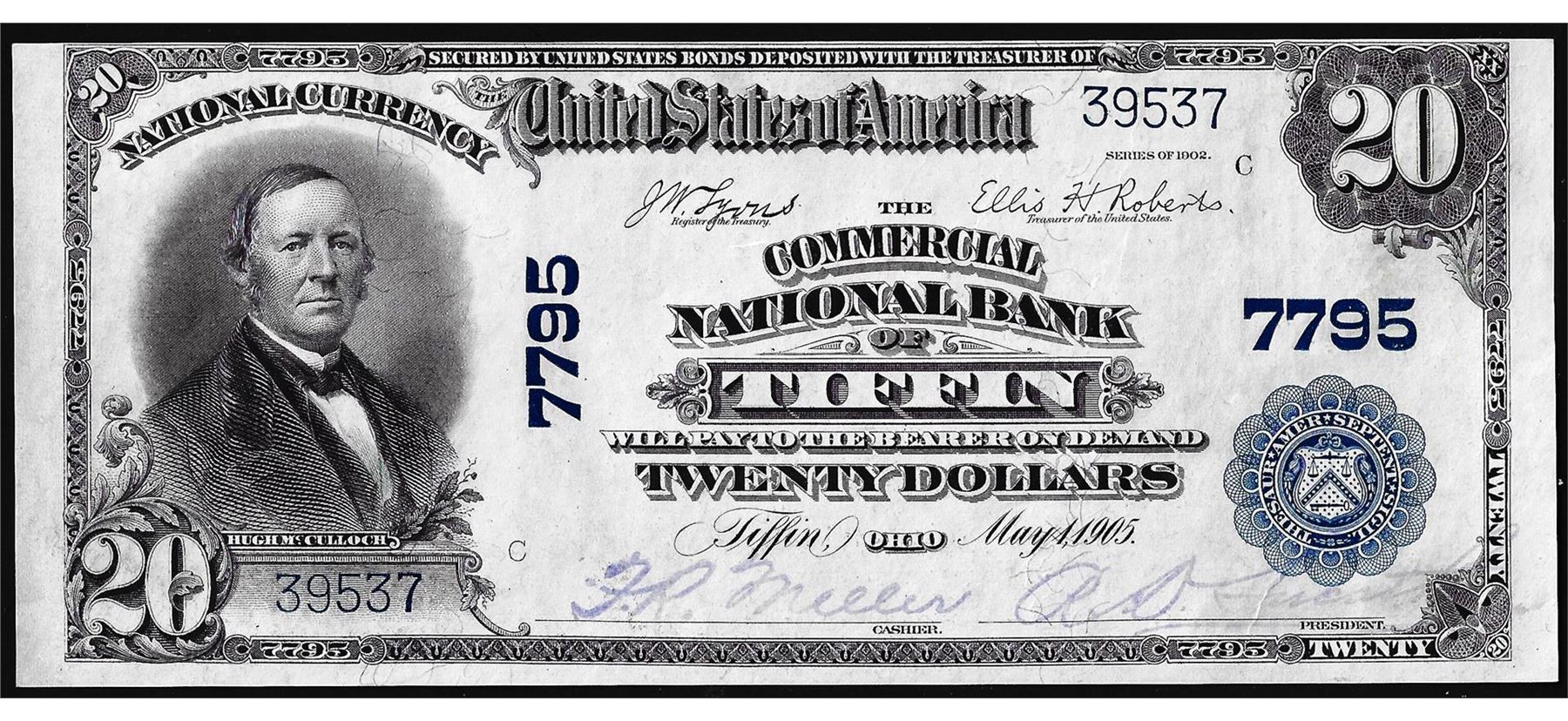 One 1902PB $20 Commercial NB of Tiffin, Ohio CH# 7795 National Currency Note.