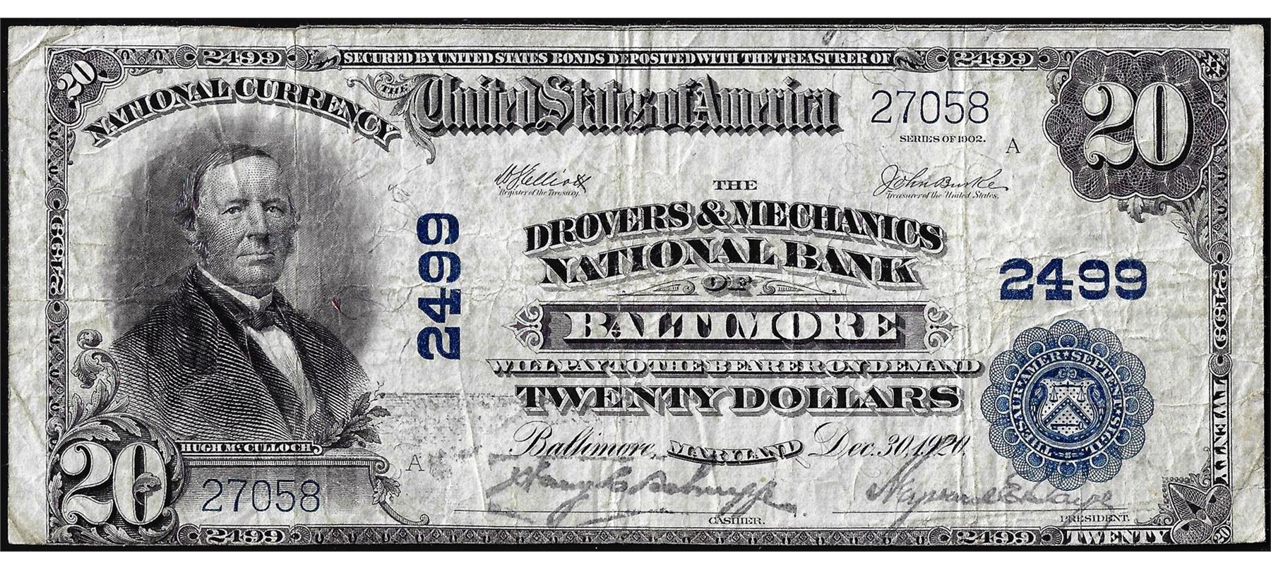 One 1902PB $20 Drovers & Mechanics National Bank Baltimore, MD CH# 2499 Currency Note.