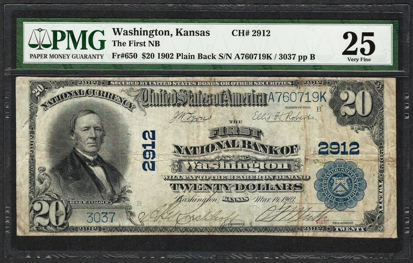 1902PB $20 First NB of Washington, Kansas CH# 2912 National Note PMG Very Fine 25