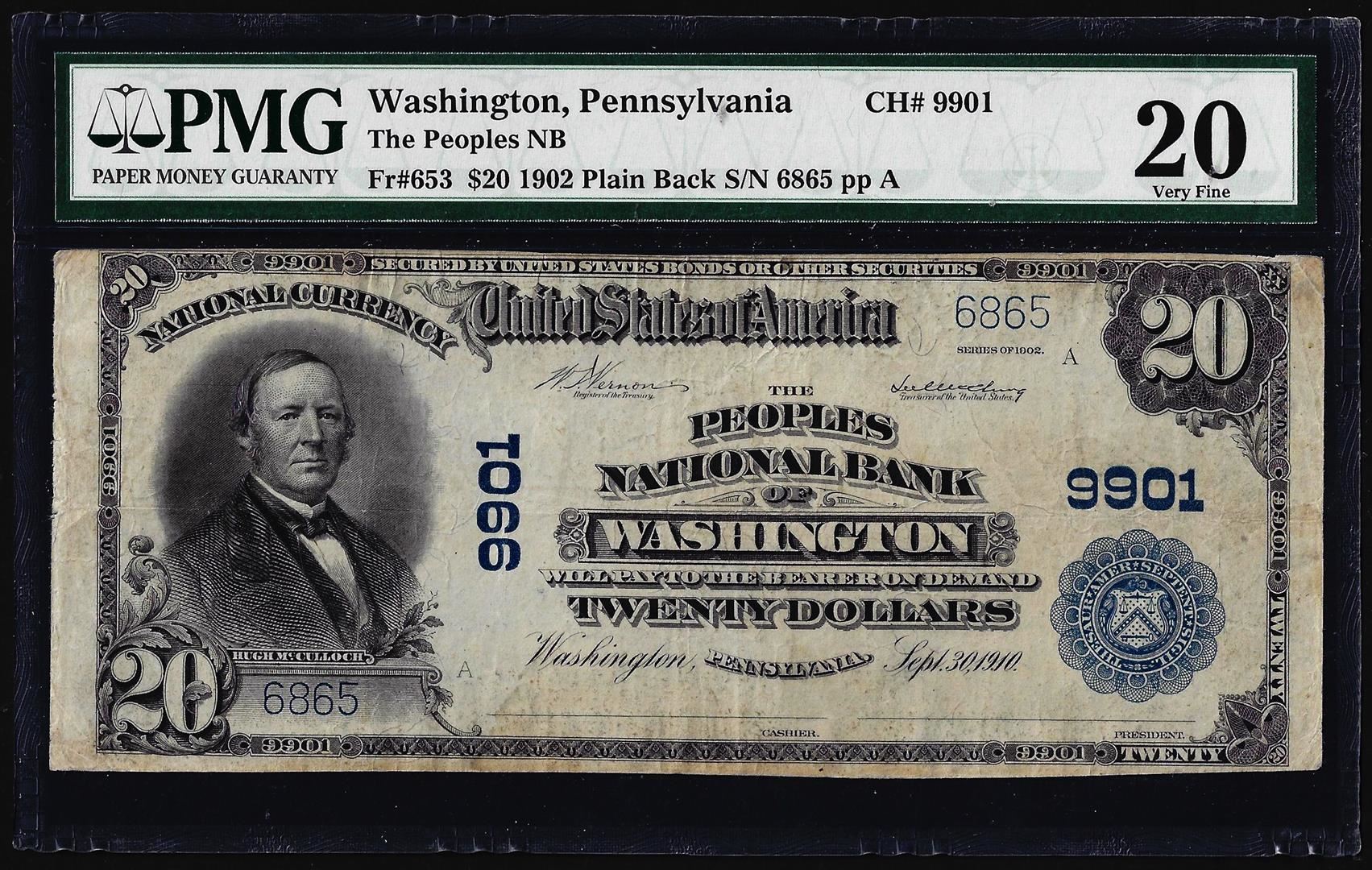 One 1902PB $20 Peoples NB of Washington, PA CH# 9901 National Currency Note PCGS VF20. PCGS Graded.