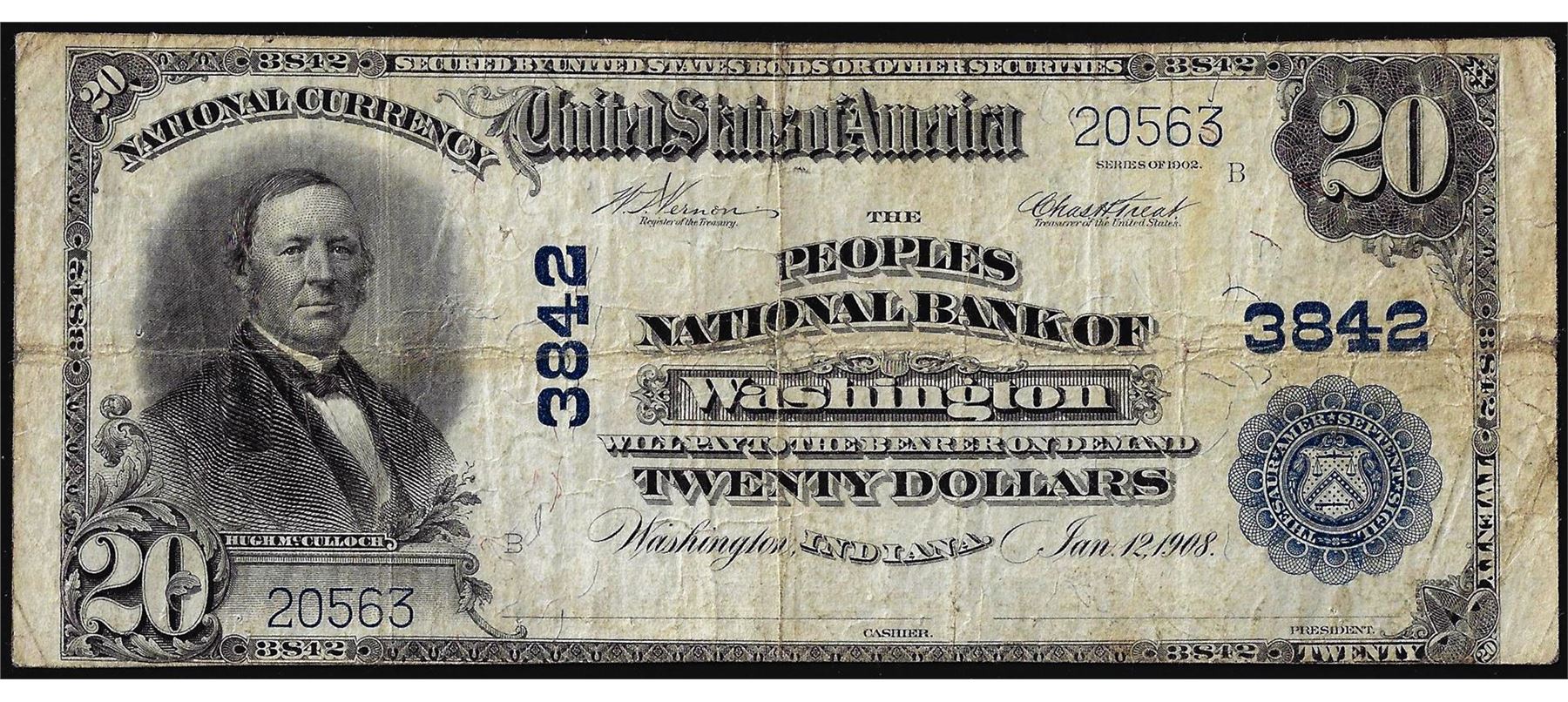 One 1902PB $20 Peoples National Bank of Washington, IN CH# 3842 National Currency Note.