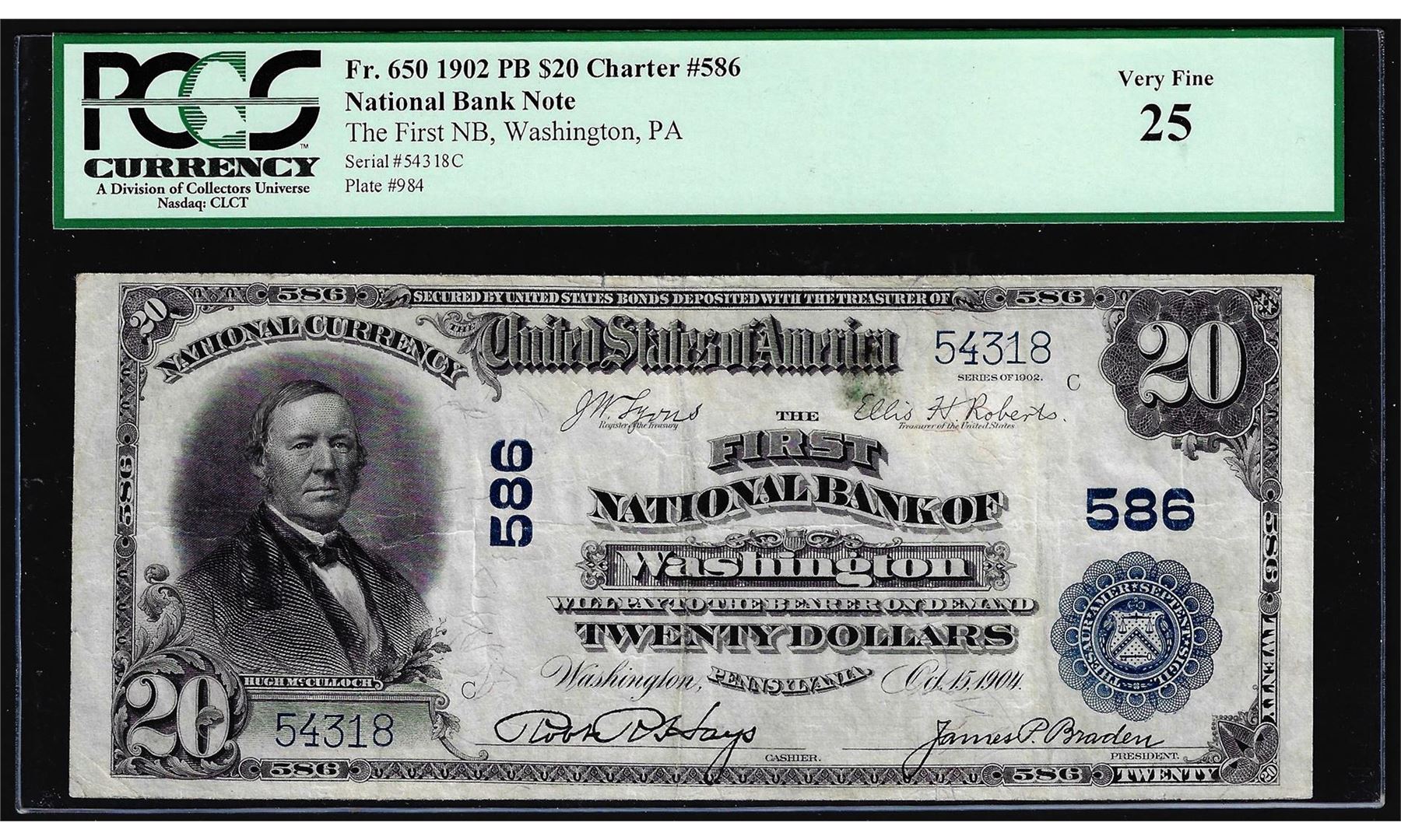One 1902PB $20 Washington, PA CH# 586 National Currency Note PCGS Extremely Fine 25. PCGS Graded.