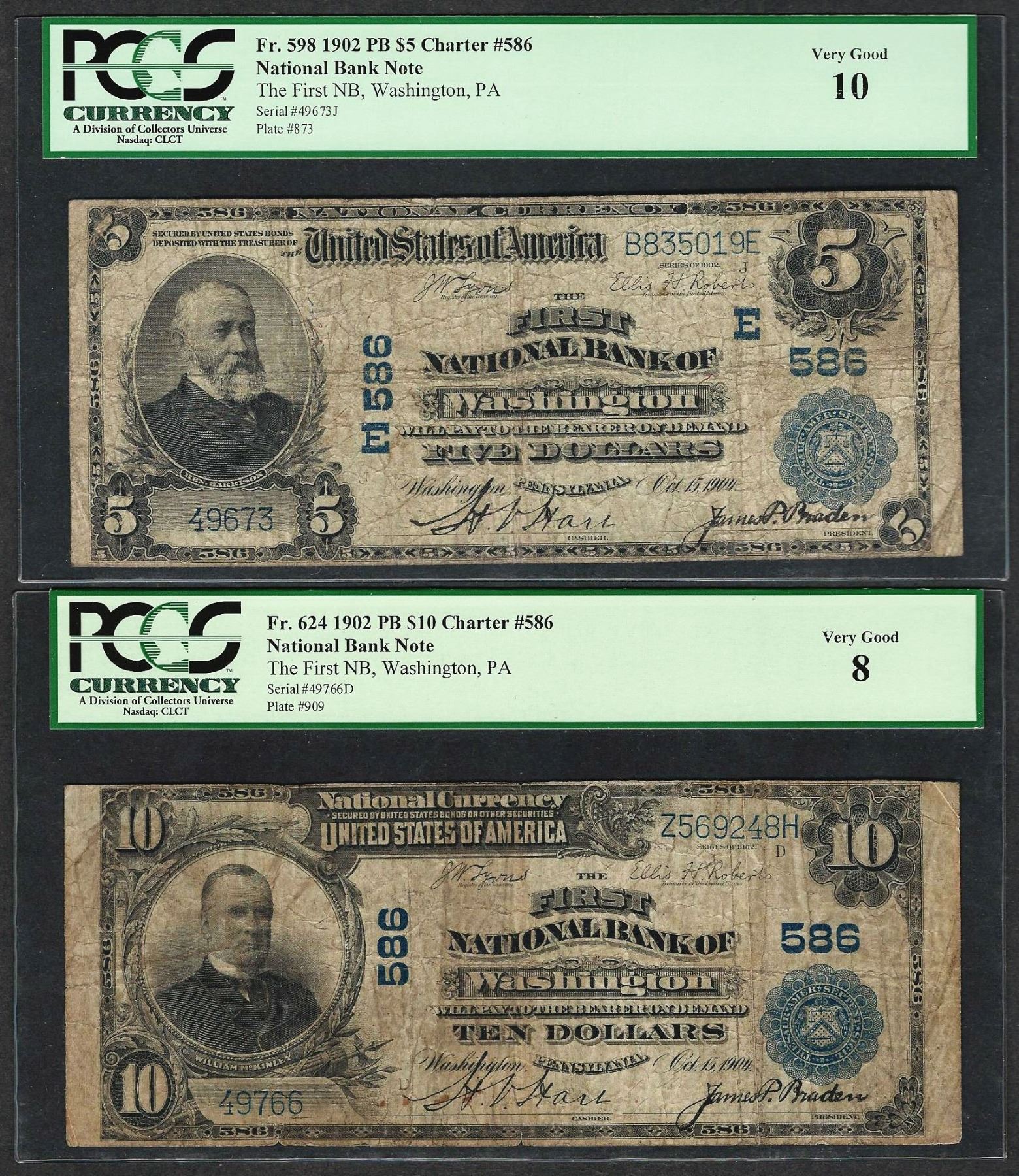 One 1902PB $5/10 First NB of Washington, PA CH# 586 National Currency Notes PCGS VG8/10.