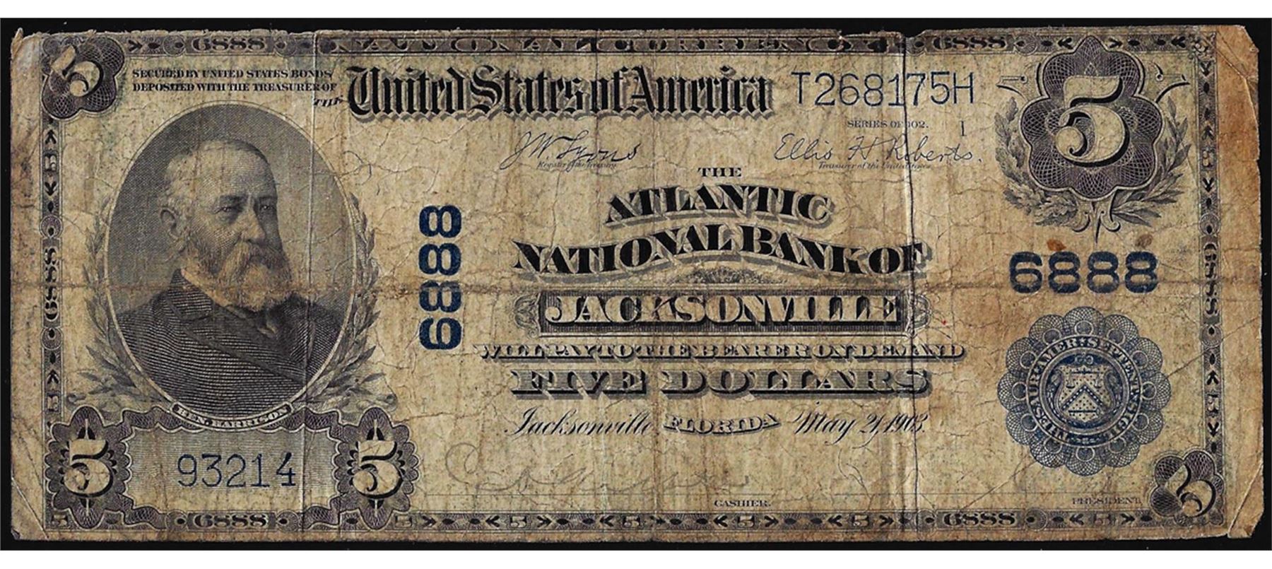 One 1902PB $5 Atlantic NB of Jacksonville, Florida CH# 6888 National Currency Note.