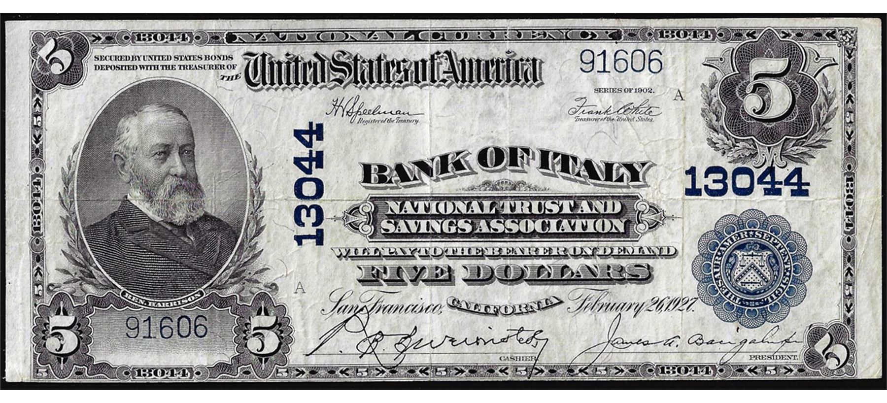 One 1902PB $5 Bank of Italy, CA CH#13044 National Currency Note.