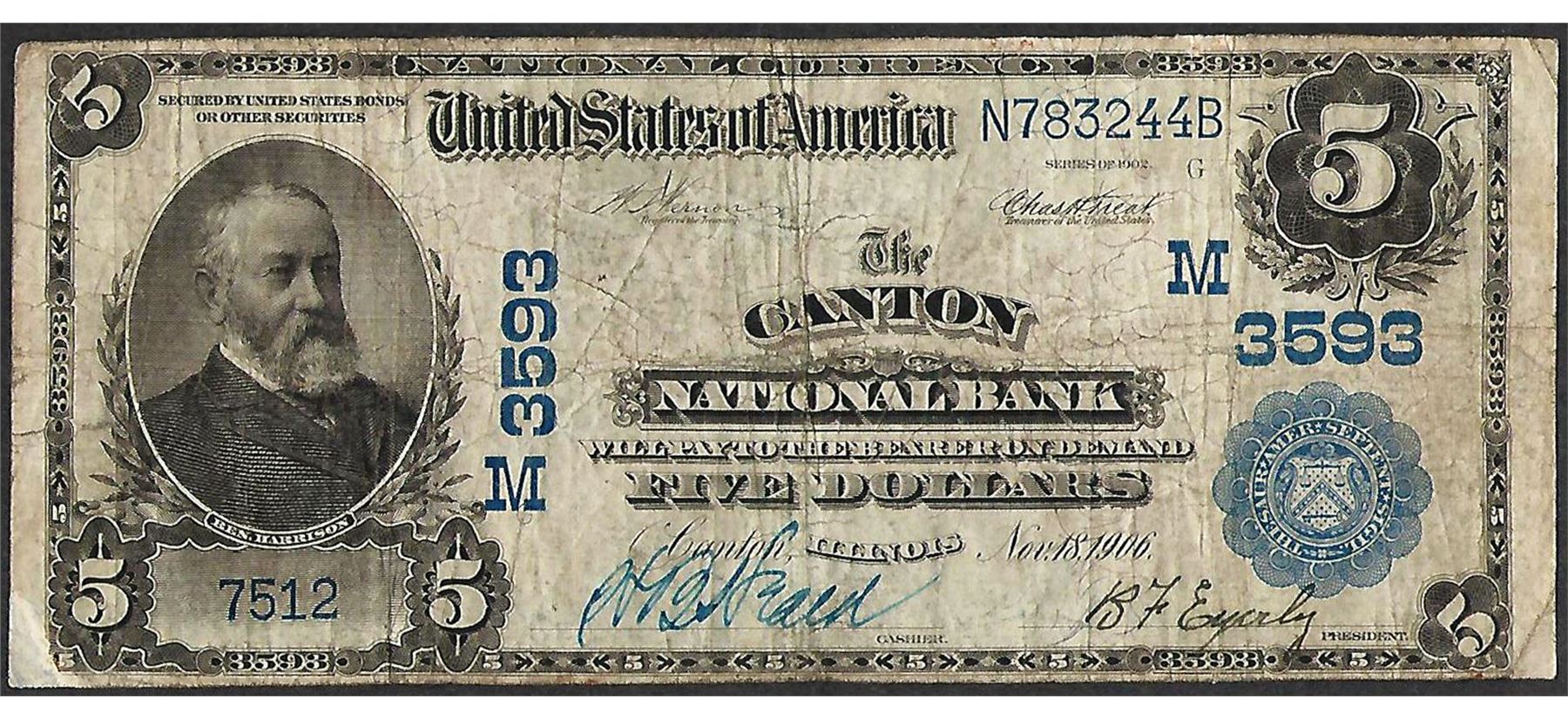One 1902PB $5 Canton National Bank, Illinois CH# 3593 National Currency Note.