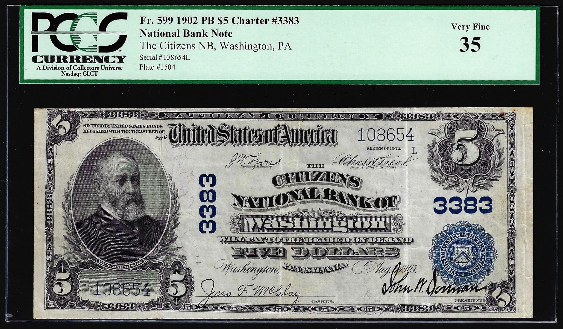 One 1902PB $5 Citizens NB of Washington, PA CH# 3383 National Currency Note PCGS VF35.