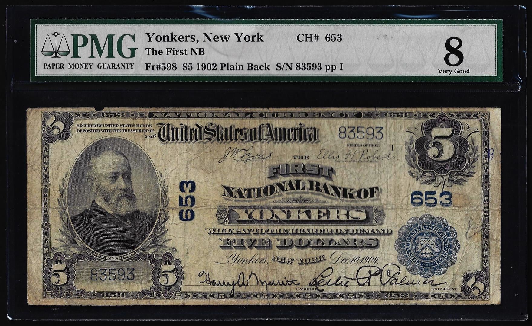 One 1902PB $5 First NB of Yonkers, NY National Currency Note CH# 653 PMG Very Good 8. PMG Certified.
