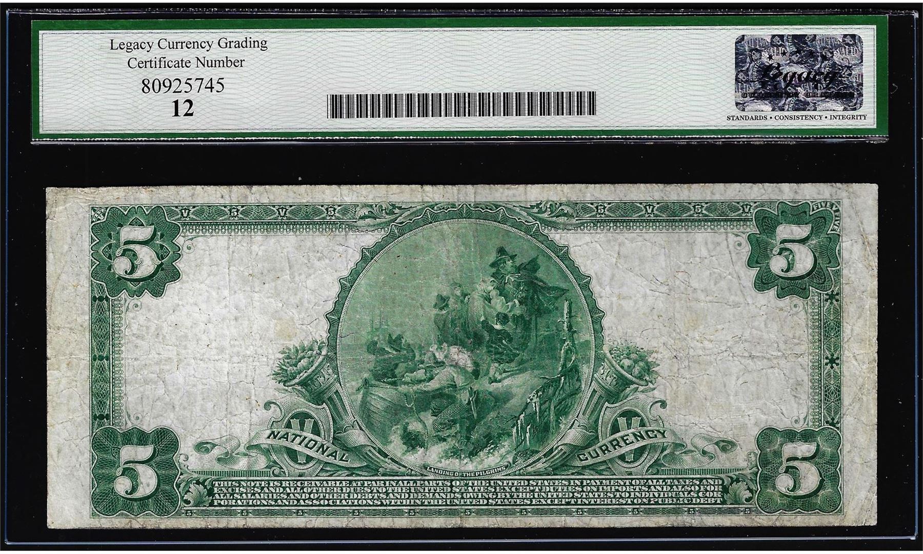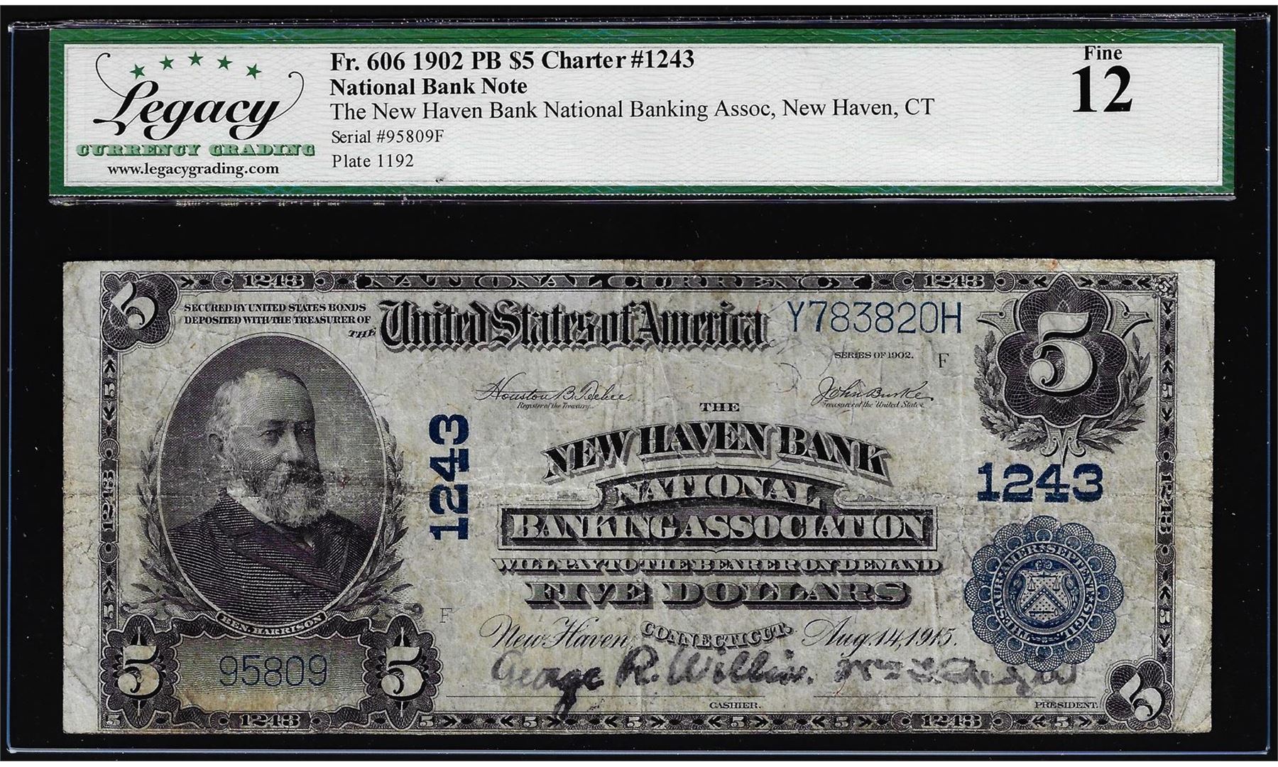 One 1902PB $5 NB New Haven, CT CH# 1243 National Currency Note Fr.606 Legacy Fine 12. Legacy Graded.