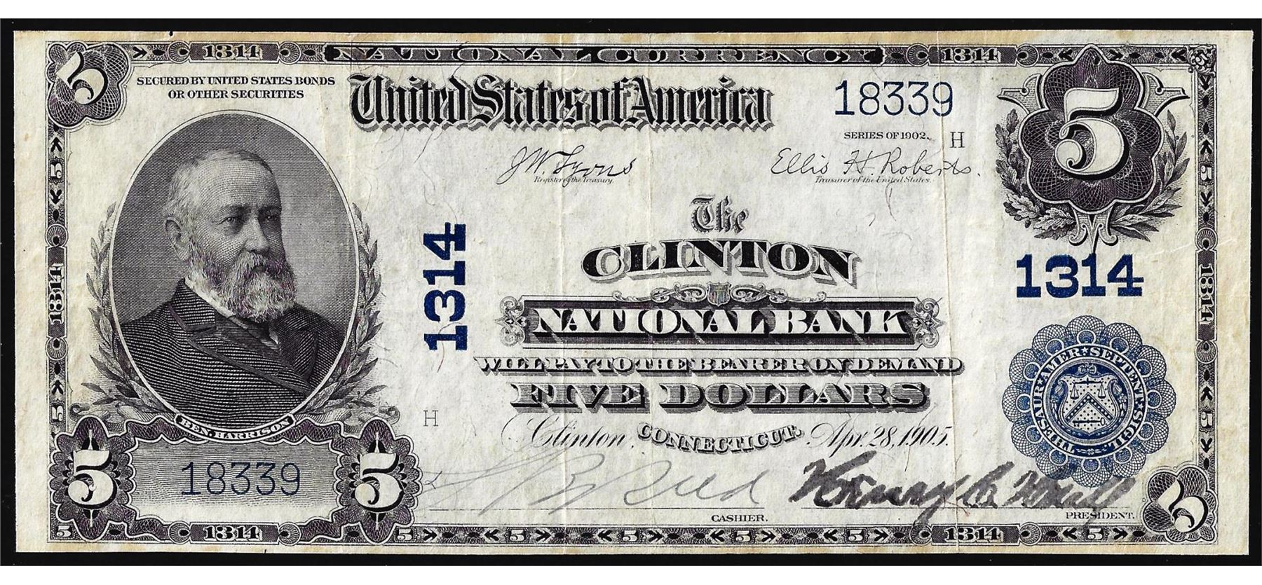One 1902PB $5 The Clinton National Bank Connecticut CH# 1314 National Currency Note.