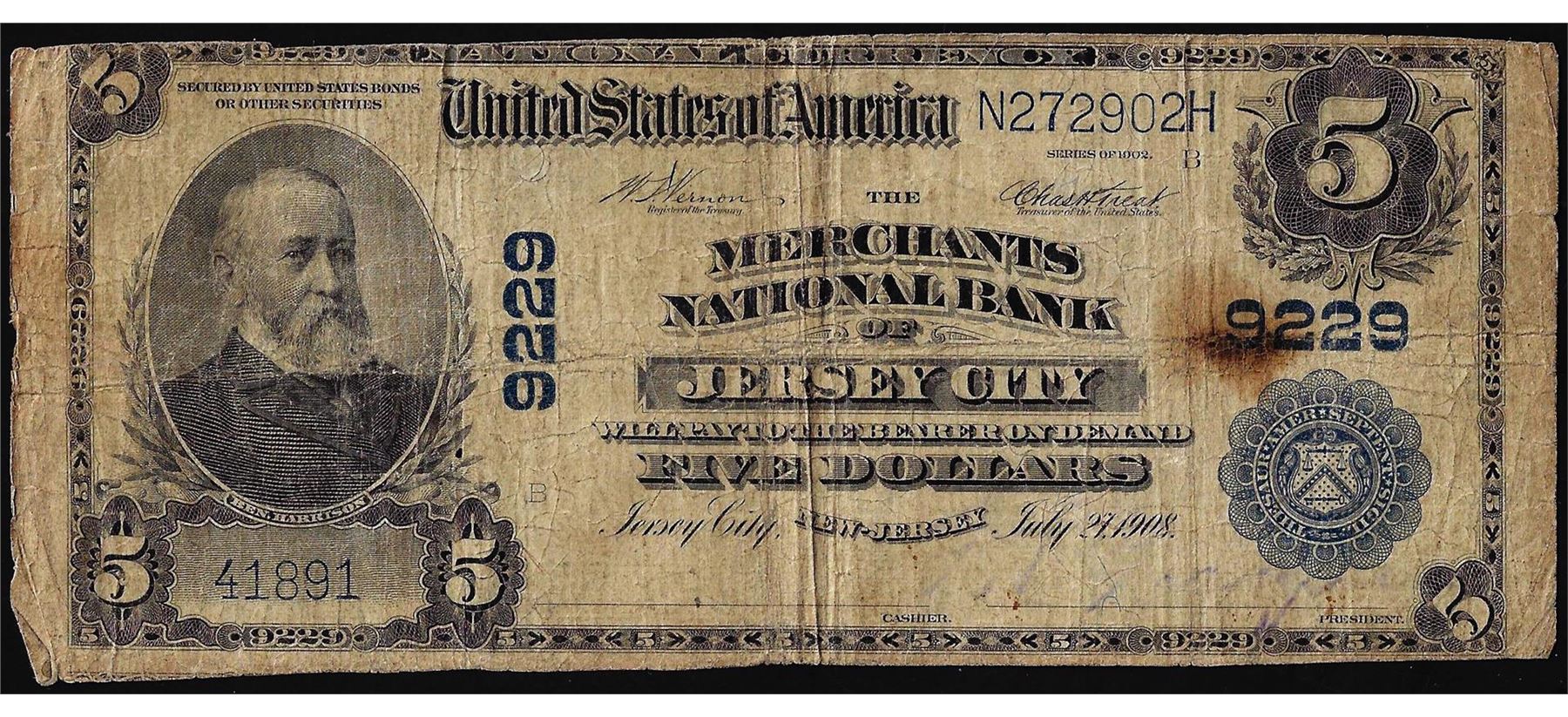 1902PB $5 The Merchants NB of Jersey City, NJ CH# 9229 National Currency Note