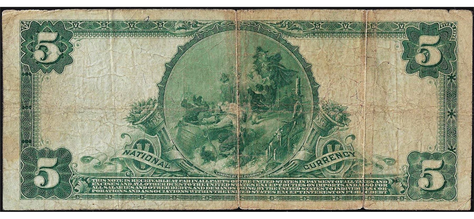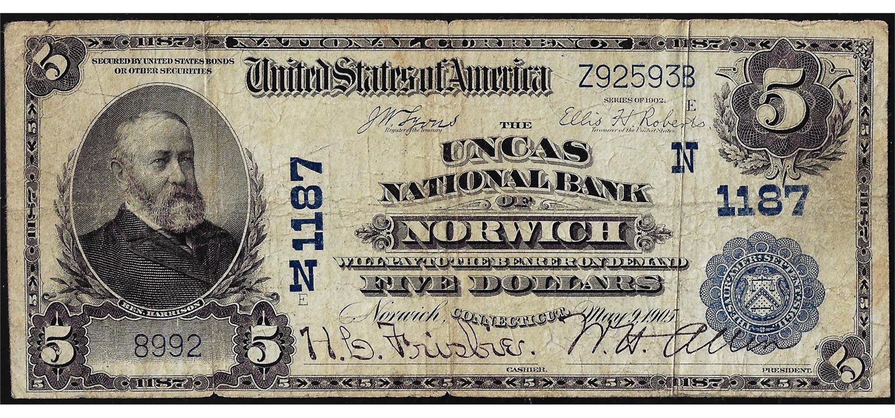 One 1902PB $5 The Uncas National Bank Norwich, CT CH# 11187 National Currency Note.