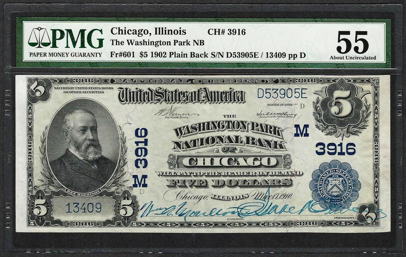 One 1902PB $5 Washington Park Chicago, IL CH# 3916 National Note PMG About Uncirculated 55. PMG Certified.