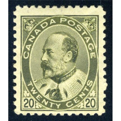 <Our item number 138676><B>1903-04. 7c Ochre and 20c Olive Green Singles. Scott <B>92, 94</B>. Unitrade 92, 94; C$520.</B> Pair of mint singles with bright, fresh color. Scarce this nice. OG/HR. <B>F.-V.F.</B> <BR>Estimated Value $150 - 250. <BR><BR>Our item number 138676<BR><IMAGES><P ALIGN="CENTER"><IMG SRC="http://www.goldbergcoins.net/liveauction/49jpegs/138676.jpg"> </P></IMAGES>