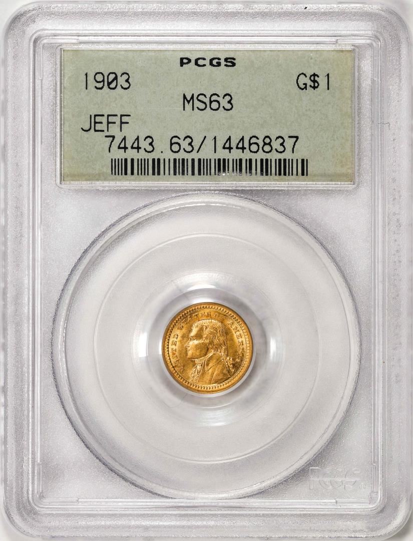 One 1903 $1 Jefferson Louisiana Purchase Commemorative Gold Dollar Coin PCGS MS63 OGH. PCGS Graded.