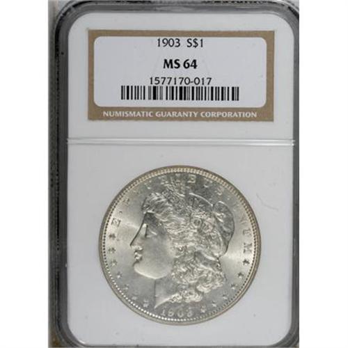 <B>1903 $1 MS64 NGC.</B></I> NGC Census: (3209/2441). PCGS Population (3694/3130). Mintage: 4,652,755. Numismedia Wsl. Price for NGC/PCGS coin in MS64: $96. (#7284)<BR><BR><B>Coin Engraver:</B> George T. Morgan<BR><BR><b>Shipping:</b> Coins & Currency (<a target="_blank" href="http://www.heritageauctions.com/common/shipping.php">view shipping information</a>)