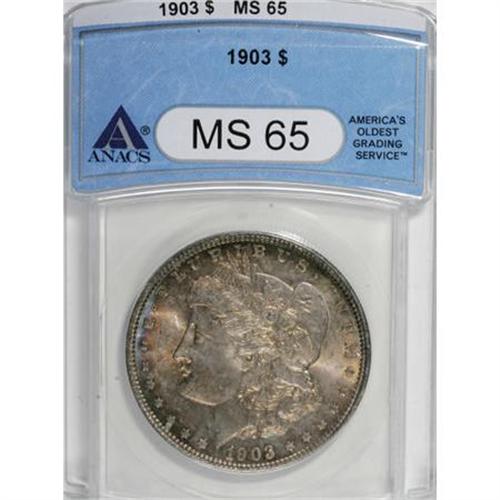 <B>1903 $1 MS65 ANACS.</B></I> NGC Census: (1906/521). PCGS Population (2343/763). Mintage: 4,652,755. Numismedia Wsl. Price for NGC/PCGS coin in MS65: $228. (#7284)<BR><BR><B>Coin Engraver:</B> George T. Morgan<BR><BR><b>Shipping:</b> Coins & Currency (<a target="_blank" href="http://www.heritageauctions.com/common/shipping.php">view shipping information</a>)