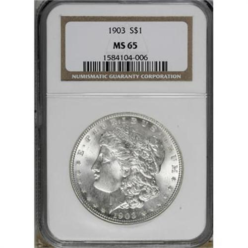<B>1903 $1 MS65 NGC.</B></I> . NGC Census: (1952/536). PCGS Population (2381/791). Mintage: 4,652,755. Numismedia Wsl. Price for NGC/PCGS coin in MS65: $220. (#7284)<BR><BR><B>Coin Engraver:</B> George T. Morgan<BR><BR><b>Shipping:</b> Coins & Currency (<a target="_blank" href="http://www.heritageauctions.com/common/shipping.php">view shipping information</a>)