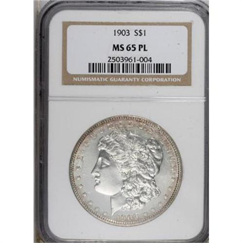 <B>1903 $1 MS65 Prooflike NGC.</B></I> A scarce, late-date Philadelphia dollar to locate with prooflike fields. Both of the major services combined have only graded 58 other pieces as MS65 PL, with a mere seven finer (10/07). The fields are brightly mirrored but, as expected, there is little contrast between the fields and devices. Fully struck.<BR><BR><B>Coin Engraver:</B> George T. Morgan<BR><BR><b>Shipping:</b> Coins & Currency (<a target="_blank" href="http://www.heritageauctions.com/common/shipping.php">view shipping information</a>)
