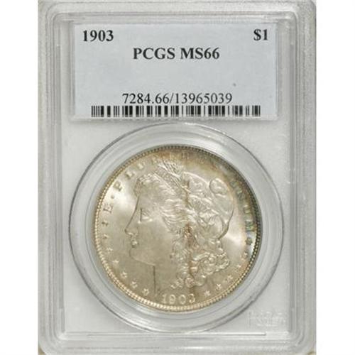 <B>1903 $1 MS66 PCGS.</B></I> PCGS Population (713/60). NGC Census: (444/78). Mintage: 4,652,755. Numismedia Wsl. Price for NGC/PCGS coin in MS66: $480. (#7284)<BR><BR><B>Coin Engraver:</B> George T. Morgan<BR><BR><b>Shipping:</b> Coins & Currency (<a target="_blank" href="http://www.heritageauctions.com/common/shipping.php">view shipping information</a>)