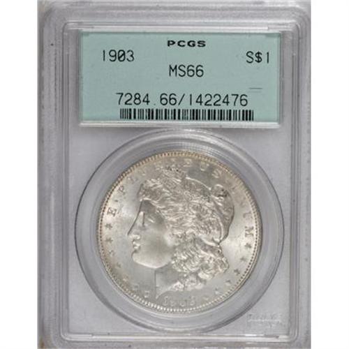 <B>1903 $1 MS66 PCGS.</B></I> PCGS Population (721/60). NGC Census: (445/80). Mintage: 4,652,755. Numismedia Wsl. Price for NGC/PCGS coin in MS66: $480. (#7284)<BR><BR><B>Coin Engraver:</B> George T. Morgan<BR><BR><b>Shipping:</b> Coins & Currency (<a target="_blank" href="http://www.heritageauctions.com/common/shipping.php">view shipping information</a>)