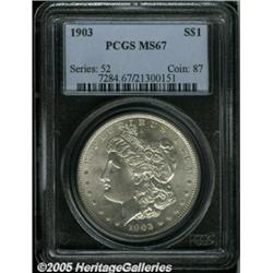 <B>1903<img border='0' src='http://www.heritagecoins.com/images/star.gif' width=10 height=10>$1 MS67 PCGS.</B></I> This is an amazing Gem quality example with satiny luster and fully brilliant surfaces. It is sharply struck and lacks any toning on either side. This example is tied for the finest ever certified by PCGS, and represents an extremely important opportunity for the advanced specialist. Population: 54 in 67, 0 finer (2/05).
