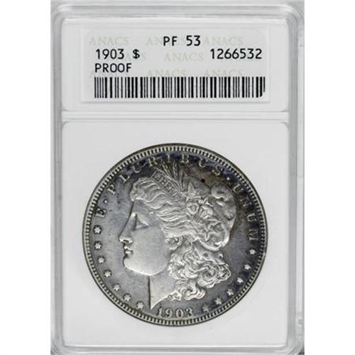 <B>1903 $1 PR53 ANACS.</B></I> Lightly worn just above Liberty's ear, and on the eagle's breast feathers, this proof example is from an original mintage of only 755 pieces. Rich peripheral toning increases the overall eye appeal of the piece, which displays some faint hairlines on each side. <BR><BR><B>Coin Engraver:</B> George T. Morgan<BR><BR><b>Shipping:</b> Coins & Currency (<a target="_blank" href="http://www.heritageauctions.com/common/shipping.php">view shipping information</a>)