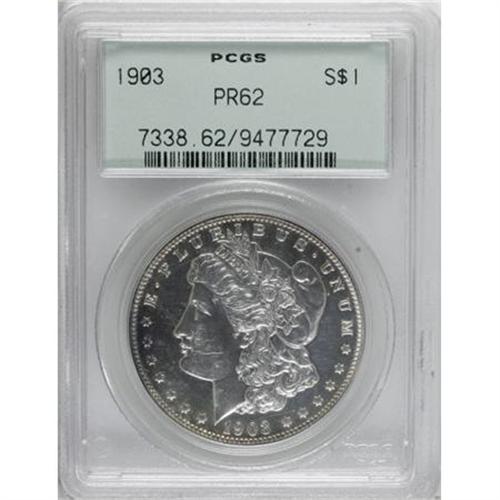 <B>1903 $1 PR62 PCGS.</B></I> Razor-sharp design elements reflect a well executed strike, and just a wisp or two of light color visits the rim areas. David Bowers (2005), writing about the 1903 proof Morgans, says: "The portraits and certain recessed parts of the die were polished--what student of the series Michael Fuljenz calls 'the chrome look'. " The grade is apparently defined by a few minor obverse wispy handling marks visible under magnification. Perhaps conservatively graded? Housed in a green-label holder.<BR><BR><b>Shipping:</b> Coins & Currency (<a target="_blank" href="http://www.heritageauctions.com/common/shipping.php">view shipping information</a>)