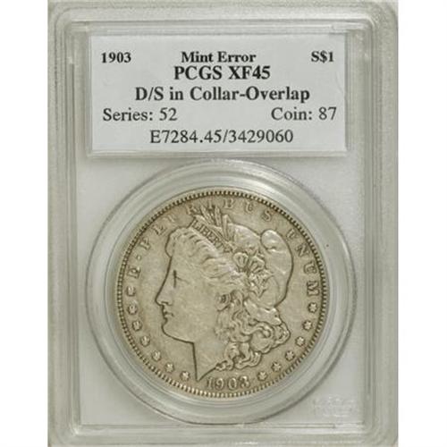 <B>1903 $1 Morgan Dollar--Struck Twice in Collar With Overlap--XF45 PCGS.</B></I> Pronounced doubling appears on Liberty's profile, the denticles and stars on the left side of the obverse, the date, and the lettering on the left side of the reverse. An interesting error caused when the coin failed to eject from the collar, rotated very slightly, and was restruck. An unusual and desirable piece that spent a brief time in circulation.<BR><BR><B>Coin Engraver:</B> George T. Morgan<BR><BR><b>Shipping:</b> Coins & Currency (<a target="_blank" href="http://www.heritageauctions.com/common/shipping.php">view shipping information</a>)