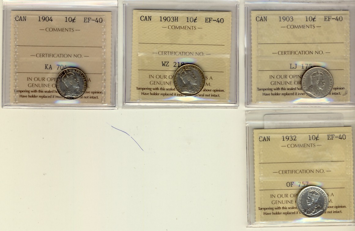 1903 10¢, 1903H, 1904 & 1932 ICCS EF40. Lot of 4 coins.