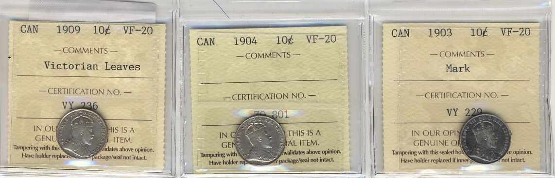 1903 10¢, 1904 & 1909 VL ICCS VF20. Lot of 3 coins with 1903 designated with mark.