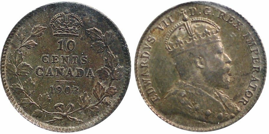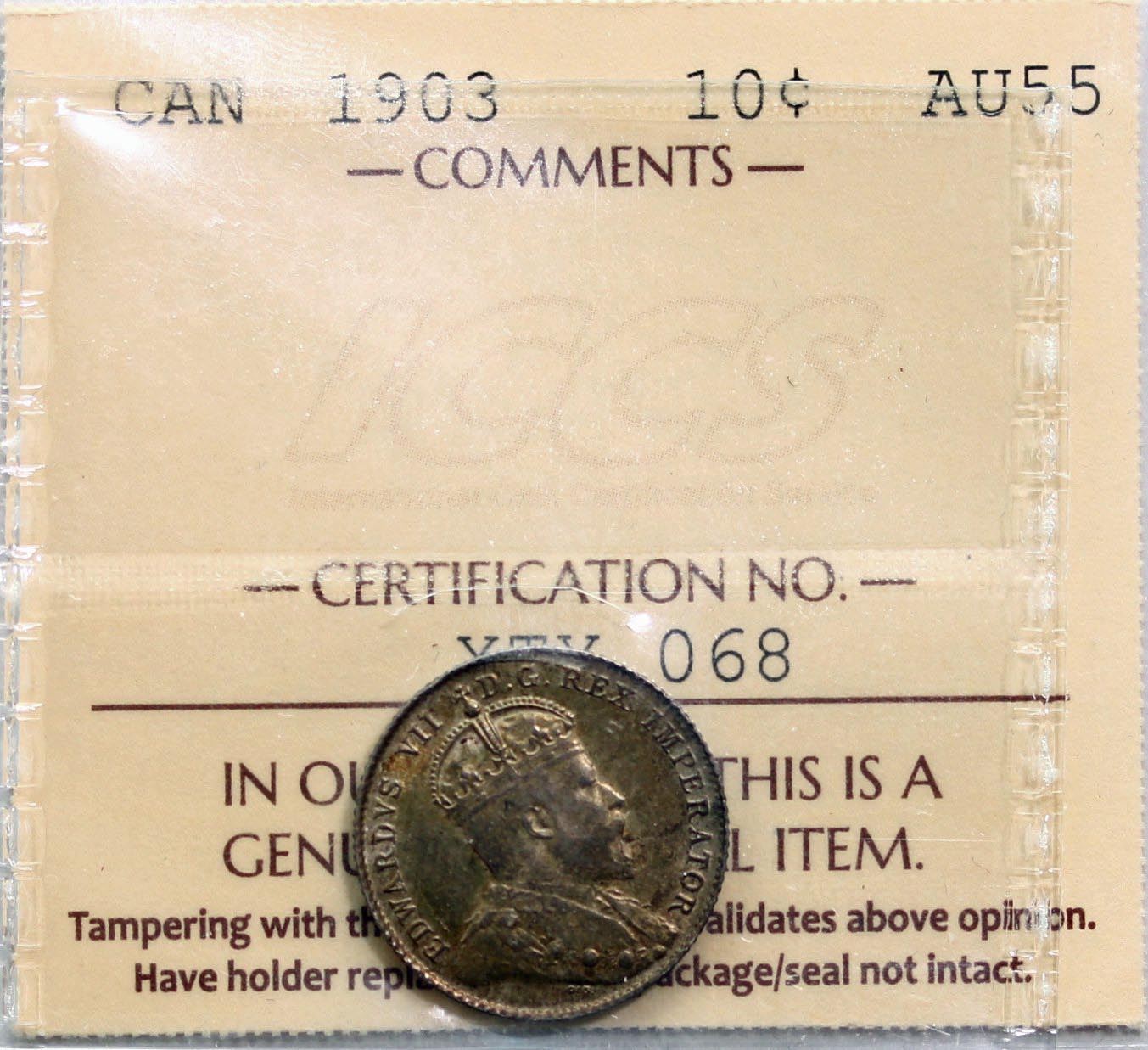 1903 10¢ ICCS Choice About Uncirculated-55. Decent example with mild golden tints.