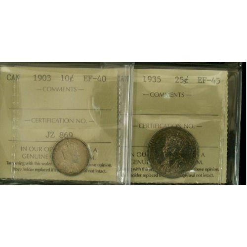 1903 10¢ ICCS EF40 and 1935 25¢ ICCS EF45, two nice problem free coins.