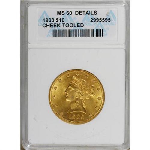 <B>1903 $10 --Cheek Tooled--ANACS. MS60 Details.</B></I> NGC Census: (45/653). PCGS Population (33/465). Mintage: 125,800. Numismedia Wsl. Price for NGC/PCGS coin in MS60: $350. (#8752)<BR><BR><B>Coin Engraver:</B> Christian Gobrecht<BR><BR><b>Shipping:</b> Coins & Currency (<a target="_blank" href="http://www.heritageauctions.com/common/shipping.php">view shipping information</a>)