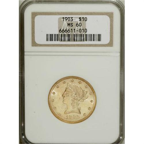 <B>1903 $10 MS60 NGC.</B></I> NGC Census: (45/658). PCGS Population (33/467). Mintage: 125,800. Numismedia Wsl. Price for NGC/PCGS coin in MS60: $365. (#8752)<BR><BR><B>Coin Engraver:</B> Christian Gobrecht<BR><BR><b>Shipping:</b> Coins & Currency (<a target="_blank" href="http://www.heritageauctions.com/common/shipping.php">view shipping information</a>)