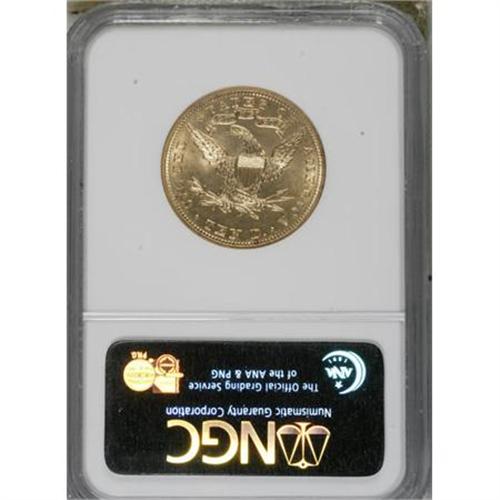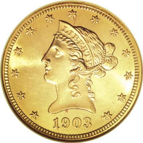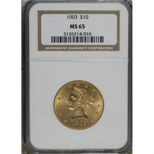 <B>1903 $10 MS65 NGC.</B></I> Despite a mintage of only 125,830 pieces, the 1903 eagle has little price pressure in most grades, since the issue has a high survival rate in Mint State. Still, it poses a significant challenge in better grades. As Garrett and Guth note, "MS-63 examples are scarce but not rare. Several dozen MS-64 examples have been certified, but only a tiny handful of these coins have earned the coveted MS-65 designation."<BR> The present Gem is one of only nine in the combined certified population, with none finer (1/08). Its gleaming straw-gold fields and decisively struck devices are equally well-preserved. A marvelous exemplar that should appeal to the collector of high-end 20th century American gold.<BR><BR><B>Coin Engraver:</B> Christian Gobrecht<BR><BR><b>Shipping:</b> Coins & Currency (<a target="_blank" href="http://www.heritageauctions.com/common/shipping.php">view shipping information</a>)