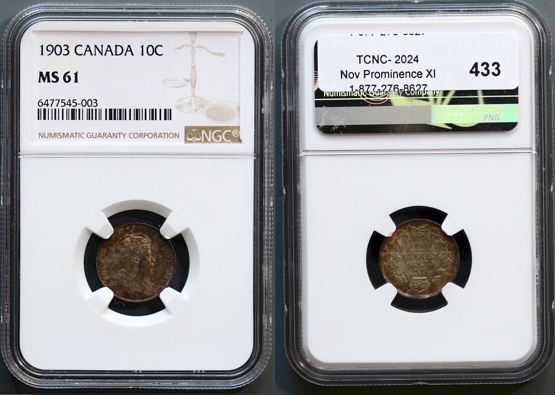 1903 10¢ NGC Mint State-61. Deep rustic tones.