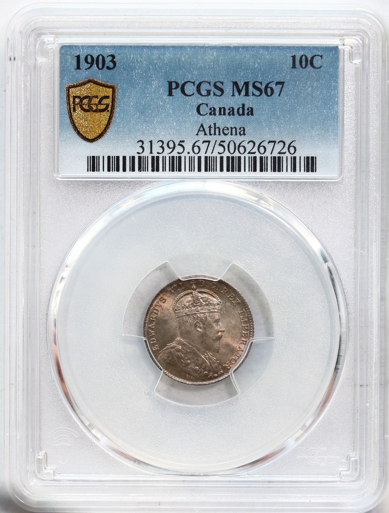 1903 10¢ PCGS Superb Gem Mint State-67. This is a Pristine and stunning issue with great eye appeal and superb fields. Among the highest and Finest examples. This coin presents an important opportunity for Registry Set collectors.