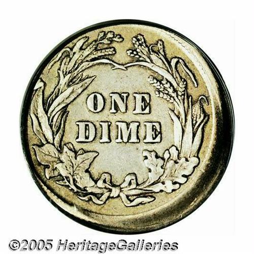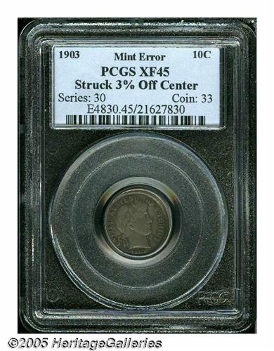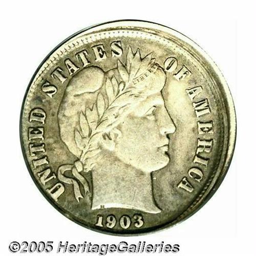 <B>1903<10C> Barber Dime--Struck 3% Off Center--XF45 PCGS.</B></I> Shifted in an 8 o'clock direction. Pleasing gunmetal-gray surfaces.<BR><I>From The Larry Rausch Collection, Part Five.</B></I>