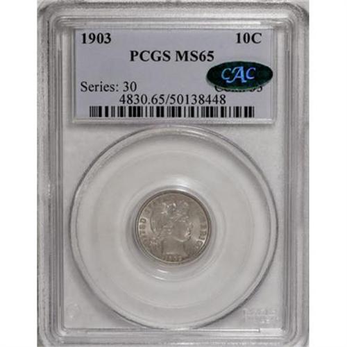 <B>1903 10C MS65 PCGS. CAC.</B></I> An attractive coin for the grade with ample luster and a decent strike for this issue. The planchet shows slight roughness on the devices, but a strong glass is needed to discern this fact. Scarce this nice and difficult to find in higher grades. Population: 21 in 65, 9 finer (1/08).<BR><I>From The Southwest Collection.</B></I><BR><BR><B>Coin Engraver:</B> Charles E. Barber<BR><BR><b>Shipping:</b> Coins & Currency (<a target="_blank" href="http://www.heritageauctions.com/common/shipping.php">view shipping information</a>)