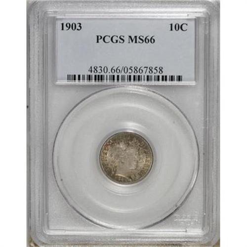 <B>1903 10C MS66 PCGS.</B></I> A richly toned example of this 20th century Barber dime issue, strongly lustrous beneath dappled gold-orange, silver-gray, and plum toning. Well-defined and captivating. Population: 9 in 66, 1 finer (2/08).<BR><BR><B>Coin Engraver:</B> Charles E. Barber<BR><BR><b>Shipping:</b> Coins & Currency (<a target="_blank" href="http://www.heritageauctions.com/common/shipping.php">view shipping information</a>)