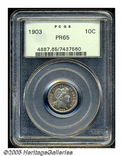 <B>1903<10C> PR65 PCGS.</B></I> Beautifully mirrored under pale golden and lilac patina. The strike is predictably razor sharp and nary a hairline can be found in the glittering fields. Population: 31 in 65, 21 finer (5/05).
