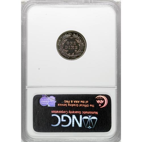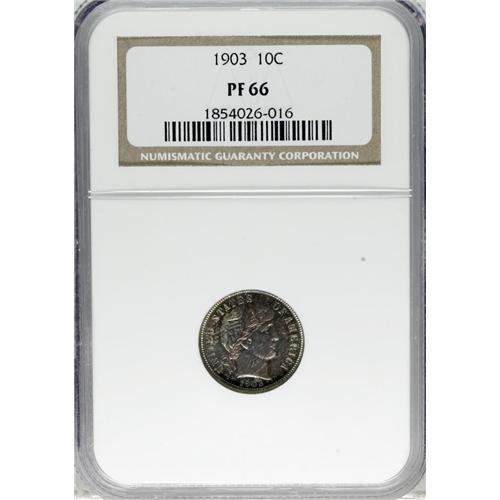 <B>1903 10C PR66 NGC.</B></I> A dense layer of lilac-red patina yields to electric-blue peripheral toning on each side. Sharply struck and contact-free, there are faint fingerprint remnants on the obverse.<BR><I>From The Utah Collection.</B></I><BR><BR><b>Shipping:</b> Coins & Currency (<a target="_blank" href="http://www.heritageauctions.com/common/shipping.php">view shipping information</a>)