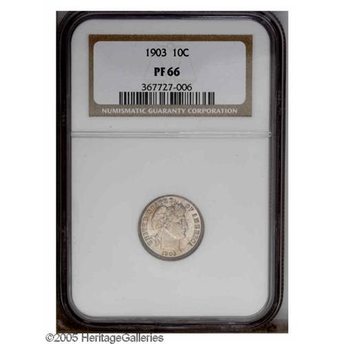 <B>1903<10C> PR66 NGC.</B></I> Sharply struck and seemingly pristine, with highly reflective fields and dappled gold color over both sides. A highly attractive Premium Gem proof. Only 755 pieces were produced in this year, at the Philadelphia Mint.