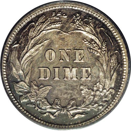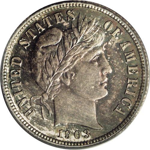 <B>1903<10C> PR66 PCGS.</B></I> A choice acquisition for color collectors, this beautiful Premium Gem proof offers fuchsia, jade-green, lemon-yellow, and ocean-blue toning that is a bit deeper on the obverse, with some original silver color in the center reverse. A trivial contact mark on Liberty's cheek is likely all that kept this coin from a Superb Gem ranking. Proof (and Mint State) Barber dimes appear to offer significant value in today's market. Population: 19 in 66, 5 finer (4/06).