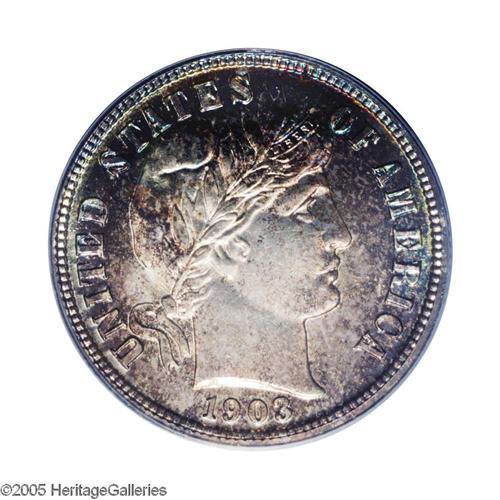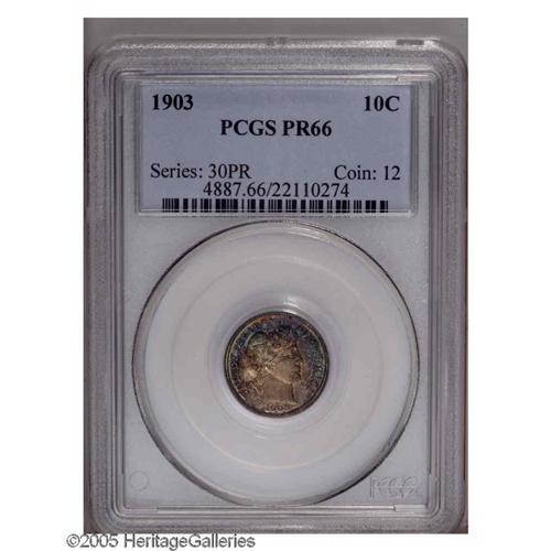 1903 10C PR66 PCGS. Mottled cobalt-blue, golden-brown, 1903[10C] PR66 PCGS.