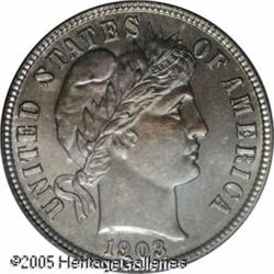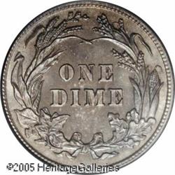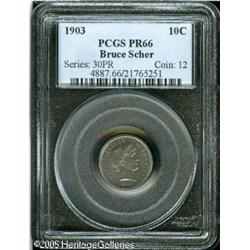 <B>1903 10C PR66 PCGS.</B></I> Rich sea-green color bathes the obverse, while the reverse features dusky champagne-gold and navy-blue patina. A well struck and virtually pristine premium Gem, no hairlines are revealed beneath the original patination. A low mintage of 755 pieces confirms the scarcity. Population: 15 in 66, 5 finer (1/05).<BR><I>From the Bruce Scher #1 All-Time PCGS Registry Set.</B></I> Lot:4063