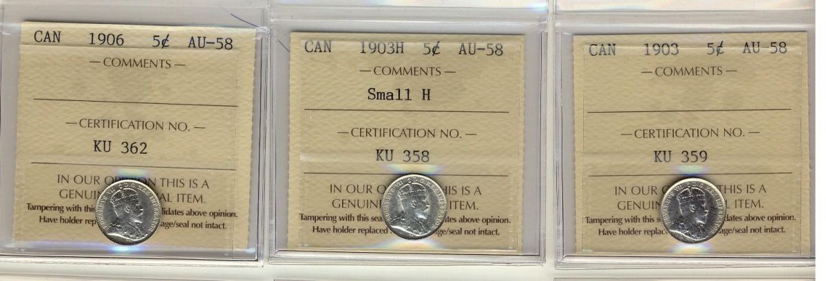 1903, 1903H Sml & 1906 5¢ ICCS AU58. Lot of 3 coins.